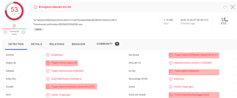 안티 바이러스 제품 중 약 74%가 악성코드라고 탐지하고 패스워드스틸러, 호크아이 악성코드라고 판단합니다.