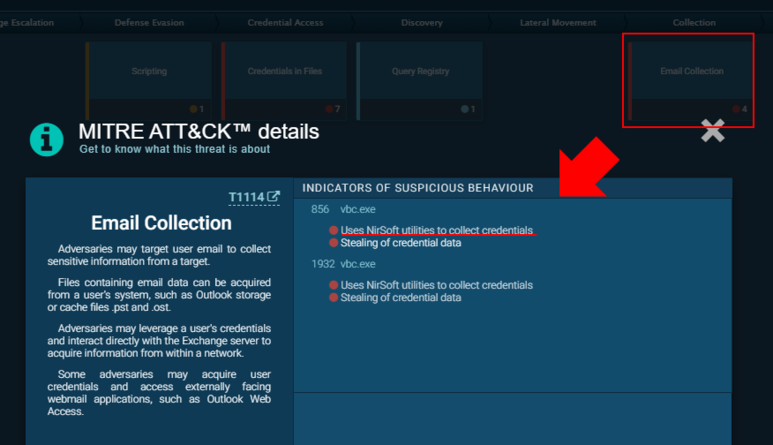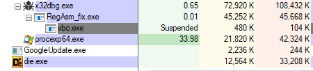 자식 프로세스 vbc.exe는 윈도우 정상 프로세스이므로 샌드박스에서 발견한 인증정보 탈취행위를 할 수 없습니다. 반대로 vbc.exe가 NirSoft도구를 사용하기 위해 코드 인젝션이 수행된다는 의미입니다. 코드 인젝션을 수행하기 위해 프로세스는 일시정지 상태입니다.