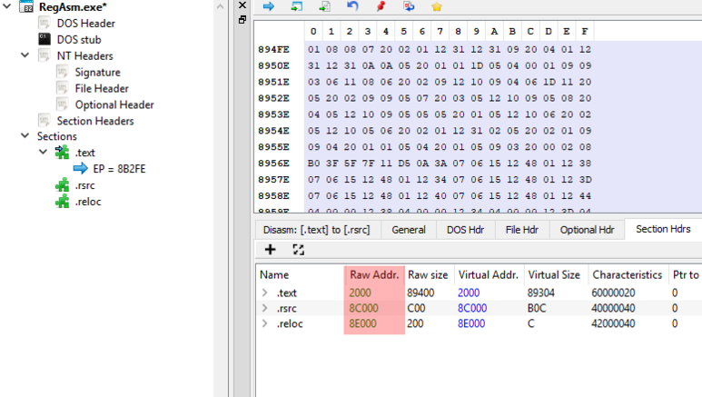 Section Hdrs로 이동합니다. 각 세션의 Raw Addr값을 Virtual Addr값과 똑같이 바꿔줍니다.