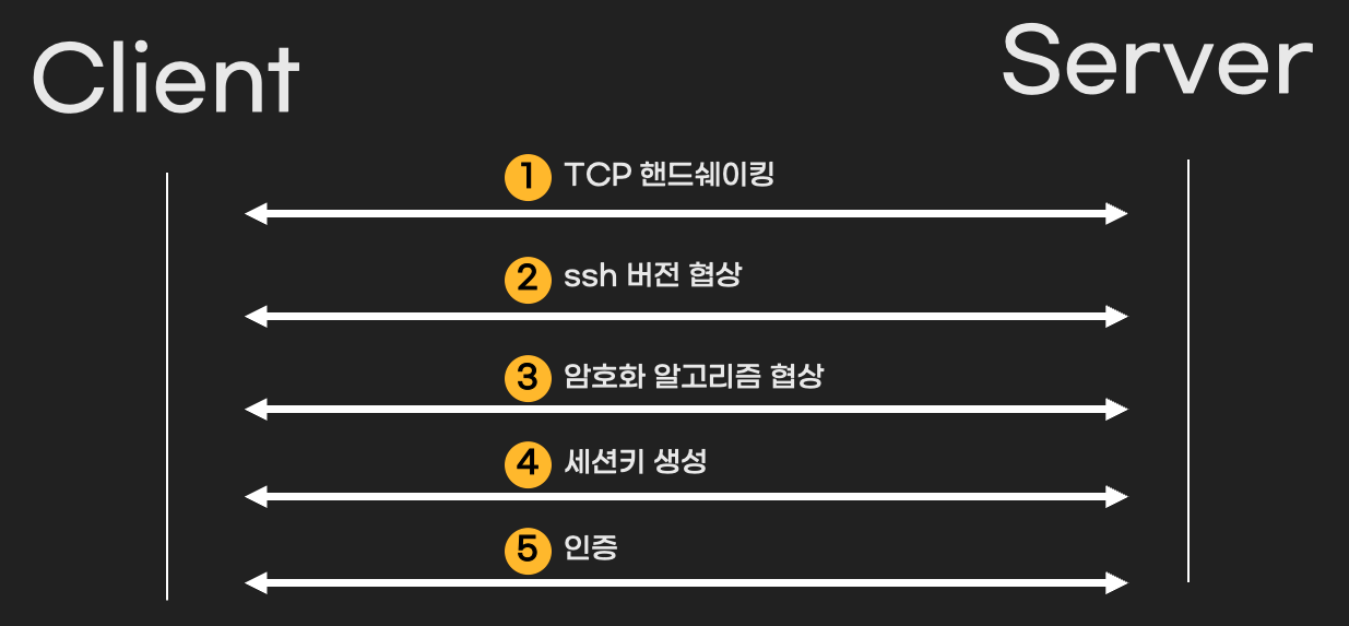 SSH프로토콜로 데이터를 암호화하기 위해 통신과정은 5단계로 진행됩니다.