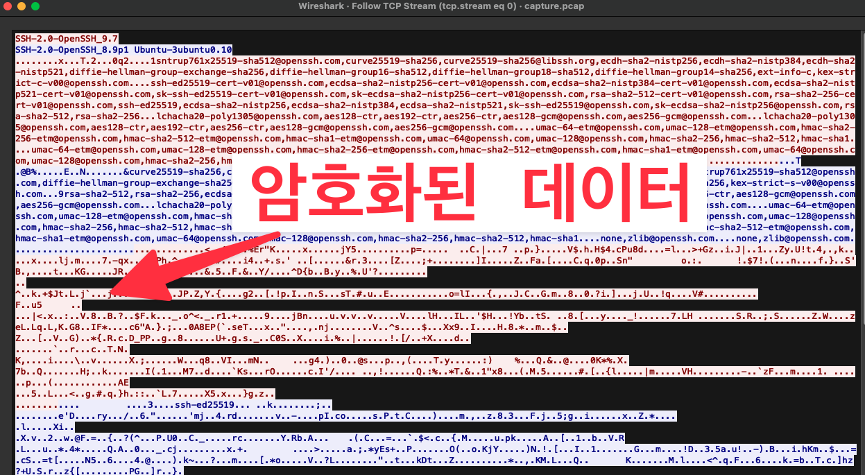 SSH는 telnet과 달리 데이터를 암호화하여 전송합니다. 그래서 누군가가 데이터를 중간에 가로채더라도 암호화된 데이터만 보일 뿐 그 내용은 알 수 없습니다.