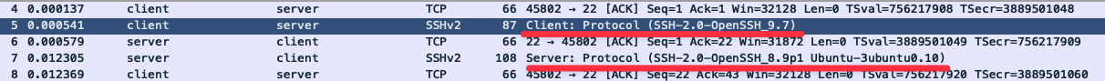 TCP핸드쉐이킹 이후에 SSH버전을 협상합니다. 패킷에서는 “Protocol”로 표시되고 각 호스트가 사용가능한 SSH버전이 보입니다.