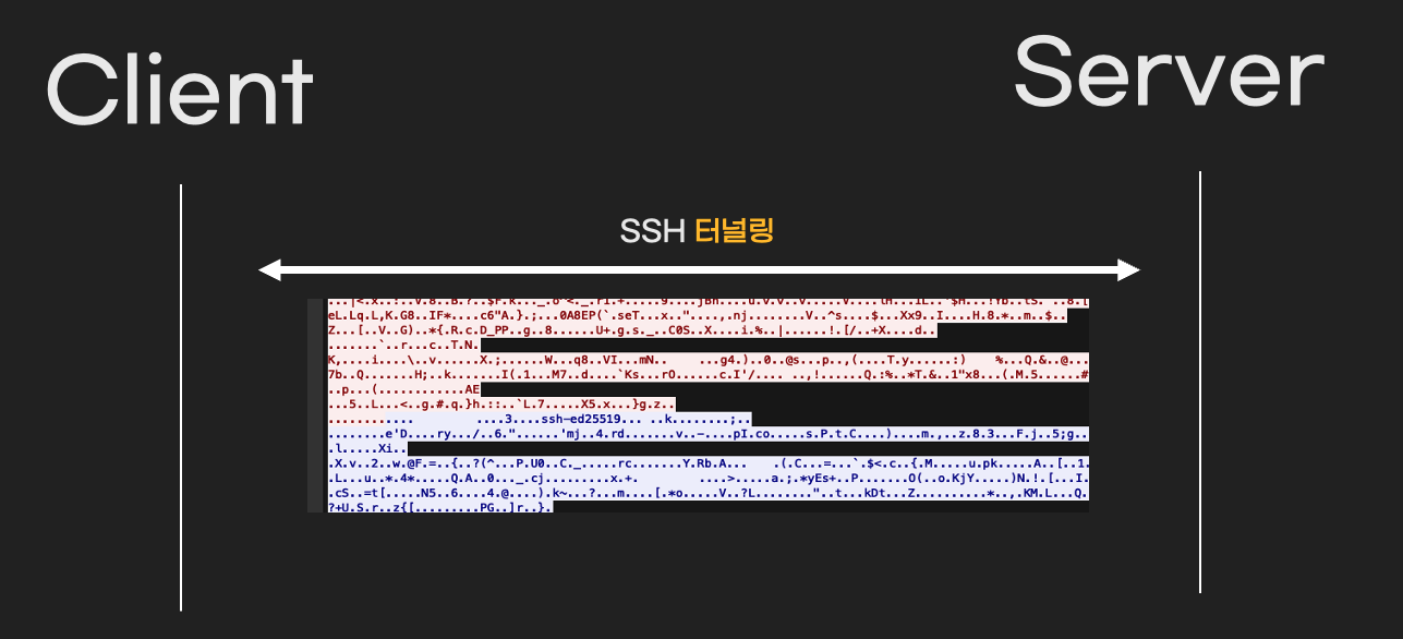 클라이언트와 서버는 세션 키를 생성한 후, 이 키를 사용해 모든 데이터를 암호화하여 전송합니다. 데이터가 가로채여도 세션 키 없이는 내용을 해석할 수 없기 때문에, 이 과정을 터널처럼 안전하게 보호한다고 표현합니다. 이를 SSH 터널링이라고 합니다.