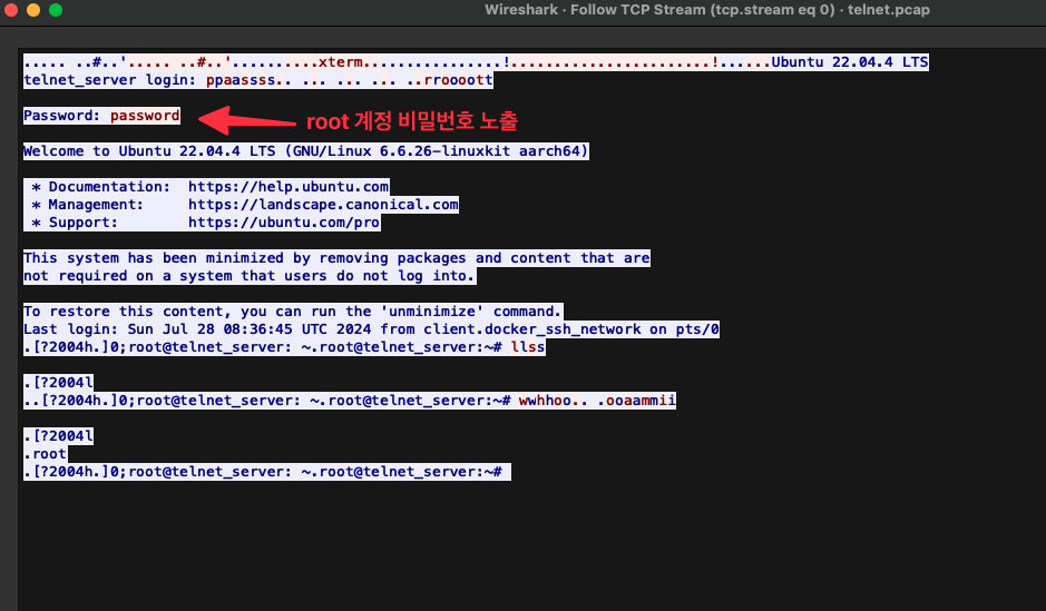 아래 예제에서는 telnet을 사용하여 원격 서버에 접속할 때 root 계정의 비밀번호가 노출된 상황을 보여줍니다.