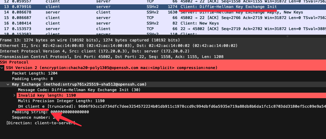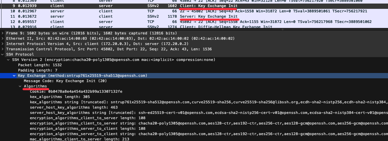 그 다음 암호화 알고리즘을 협상합니다. 패킷에서는 “Key Exchange Init”으로 표시됩니다.