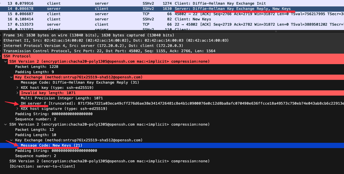 서버는 파라미터 e를 생성하고 클라이언트에게 전달받은 파라미터 e를 사용해서 세션키를 생성합니다. 파라미터 e는 클라이언트에게 전송합니다. 파라미터 e는 누구나 볼 수 있습니다. 패킷에서는 “Server Key Exchange Reply, New Keys”라고 표시됩니다.