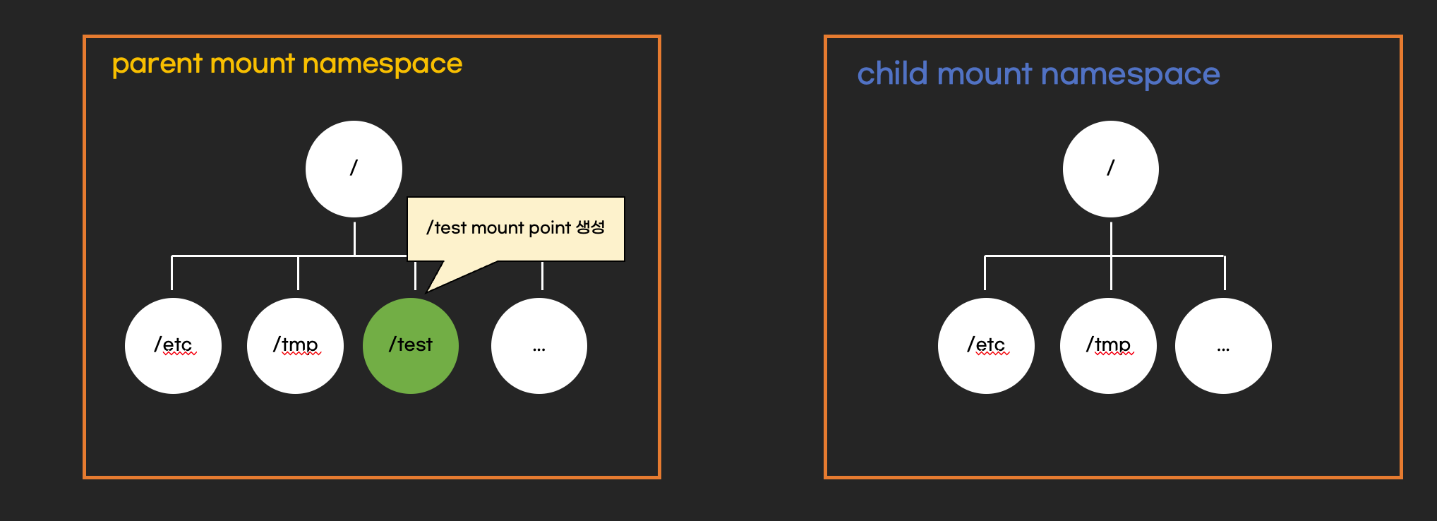 예를 들어, A mount namespace에서 생성된 /test 마운트 포인트는 B mount namespace에서는 존재하지 않습니다. 왜냐하면 이 두 namespace는 서로 다른 파일 시스템 마운트 환경을 사용하기 때문입니다.