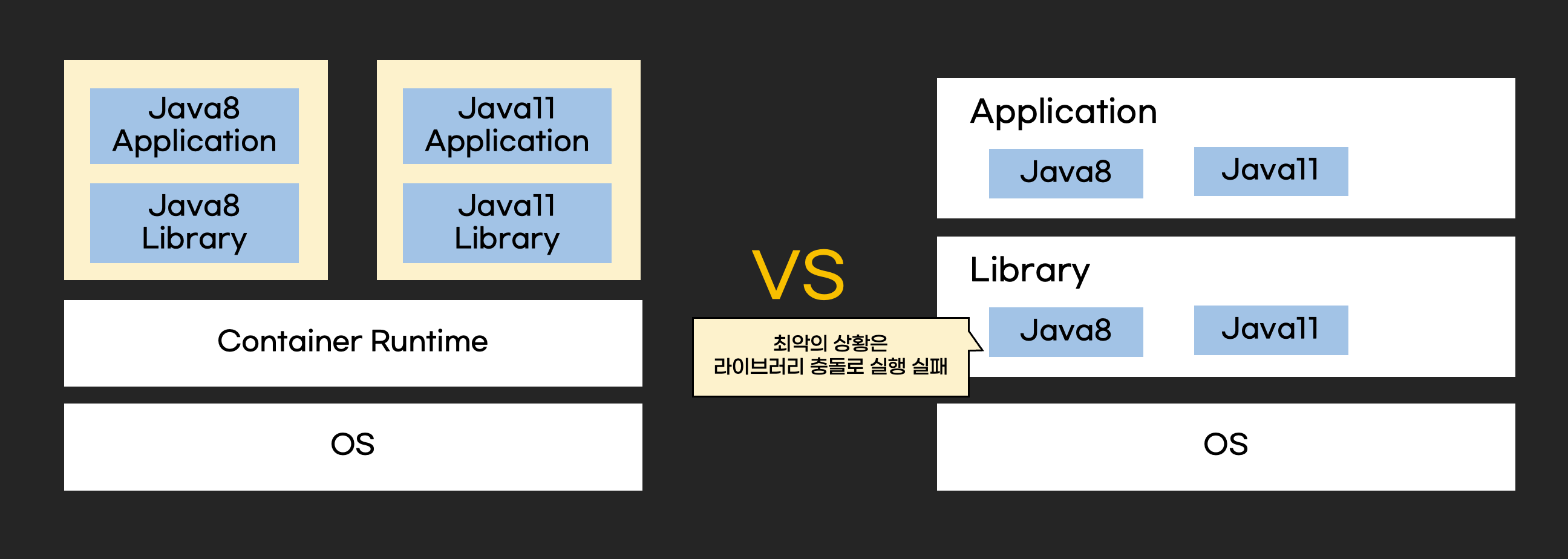 예를 들어 자바 8을 실행하는 컨테이너는 자바8실행파일과 자바8에 관련된 라이브러리가 있습니다. 자바11을 실행하는 컨테이너도 자바11실행파일과 자바11에 관련된 라이브러리가 있습니다. 서버에서 자바 8과 자바11을 실행한다면, 자바8과 11 실행파일 모두 가지고 있어야되고 관련 라이브러리를 설치해야 합니다. 최악의 경우 라이브러리 충돌로 인해 설치가 안되는 슬픈상황이 발생합니다.