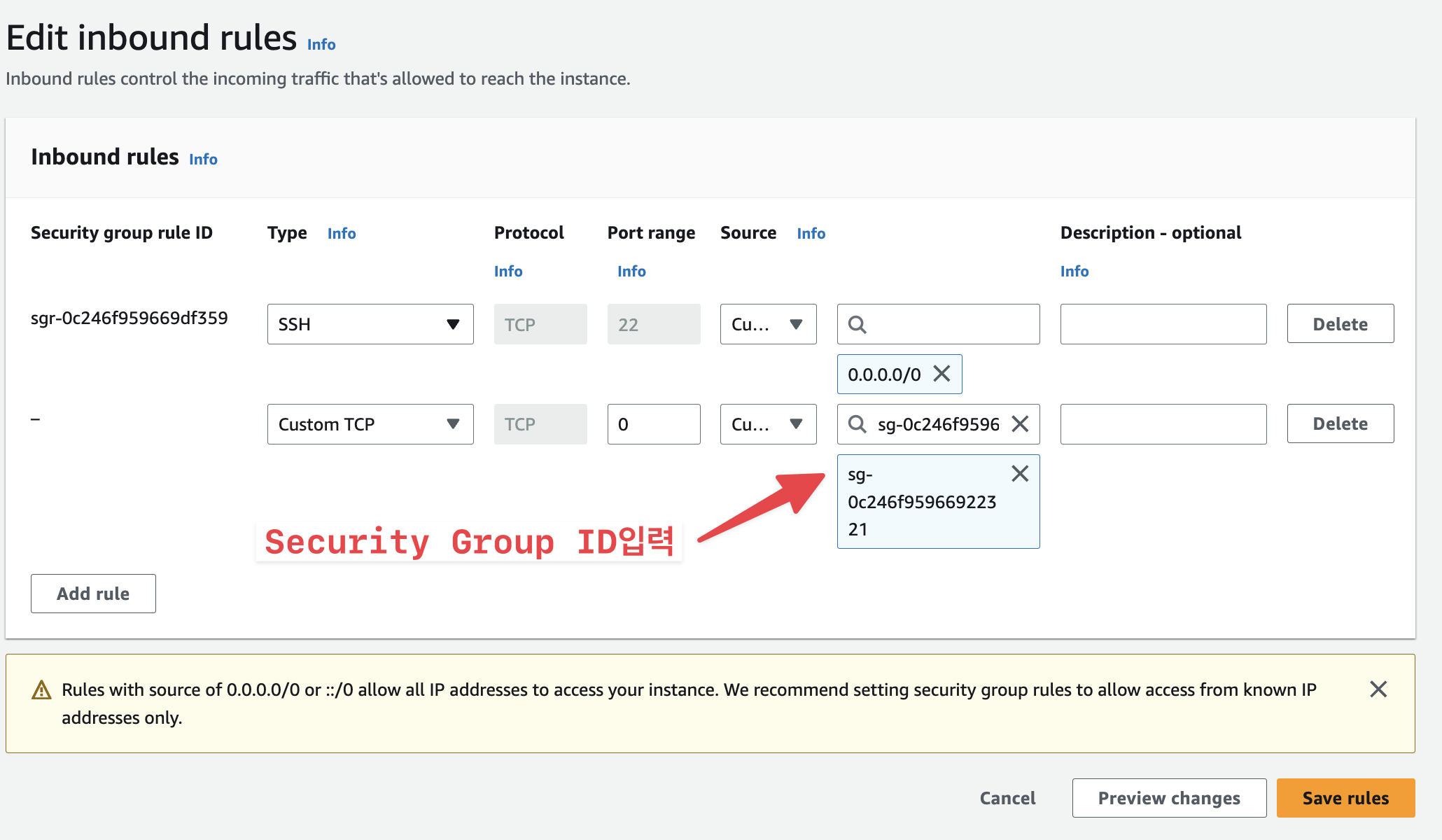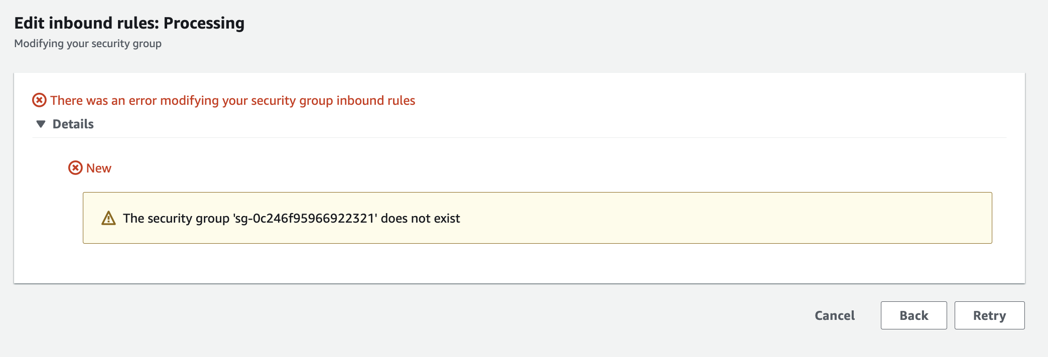 안되는지 쉽게 확인하려면 무식하게 직접 설정하면서 깨닫는 수밖에 없습니다. Security Group 체이닝이 불가능한 상황이라면, Security Group이 있더라도 존재하지 않는 Security Group라고 에러가 발생합니다.