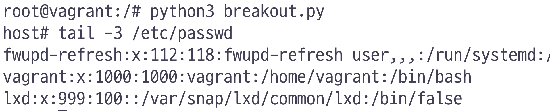 탈옥코드를 실행하고 /etc/passwd를 확인하여 탈옥이 실패했는지 확인합니다. debian 컨테이너의 /etc/passwd가 보여야 합니다.