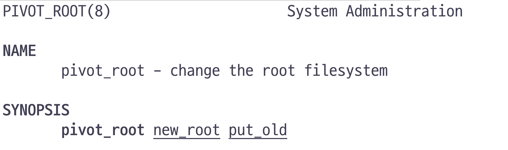 pivot_root 원리는 루트 디렉터리가 “/”로 설정되도록 루트 파일 시스템을 변경합니다. man chroot와 man pivot_root의 설명을 보면, chroot는 루트 디렉터를 변경하고 pivot_root는 루트 파일 시스템을 변경한다고 되어 있습니다.