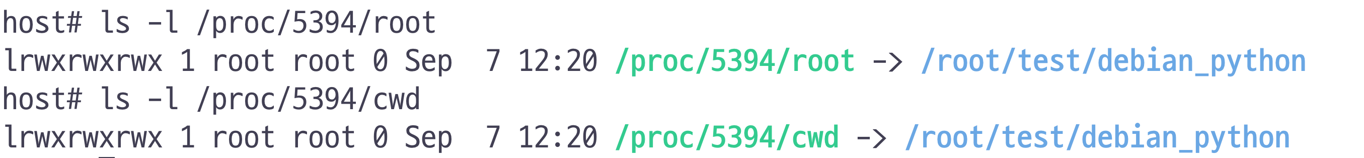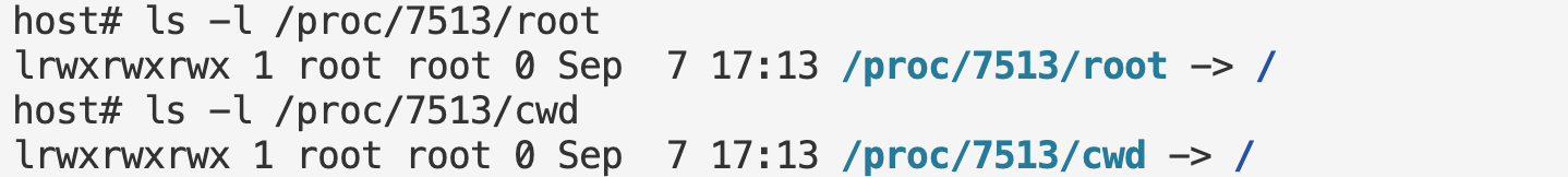 루트 디렉터리와 작업 디렉터리는 /proc/{process_id}/root, /proc/{process_id}/cwd에 있습니다.