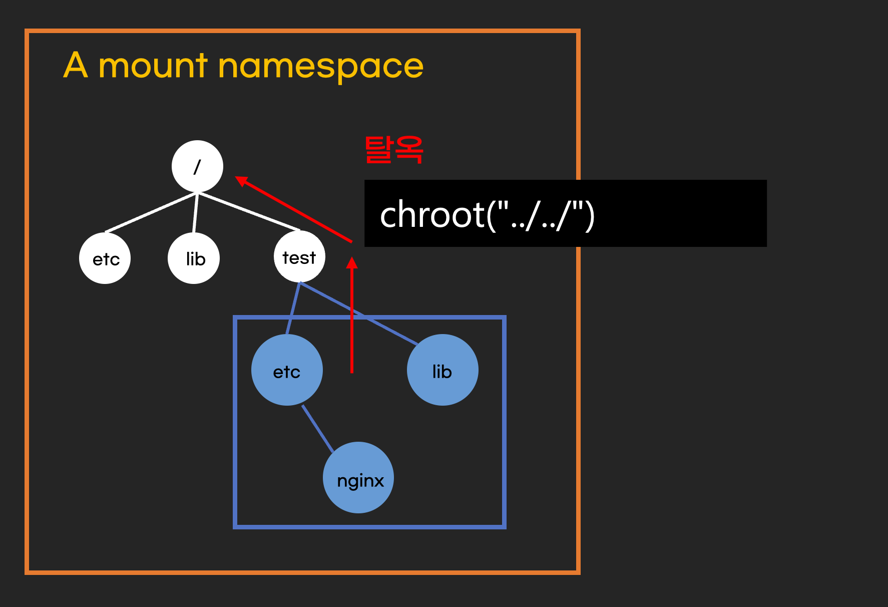pivot_root는 chroot의 취약점을 보완했습니다. pivot_root를 실행하면 아래 그림처럼 루트 디렉터리가 “/”로 변경됩니다. 루트 디렉터리가 상대경로로 설정되는 chroot와 다른 결과입니다.