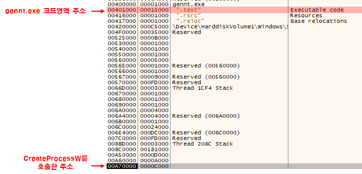 CreateProcessW가 실행된 곳 주소를 보면 gennt.exe의 코드영역에 벗어나 있습니다. 즉 실행 중에 메모리를 할당하고 어떤 데이터를 언패킹한 것으로 생각합니다.