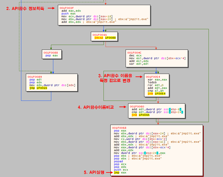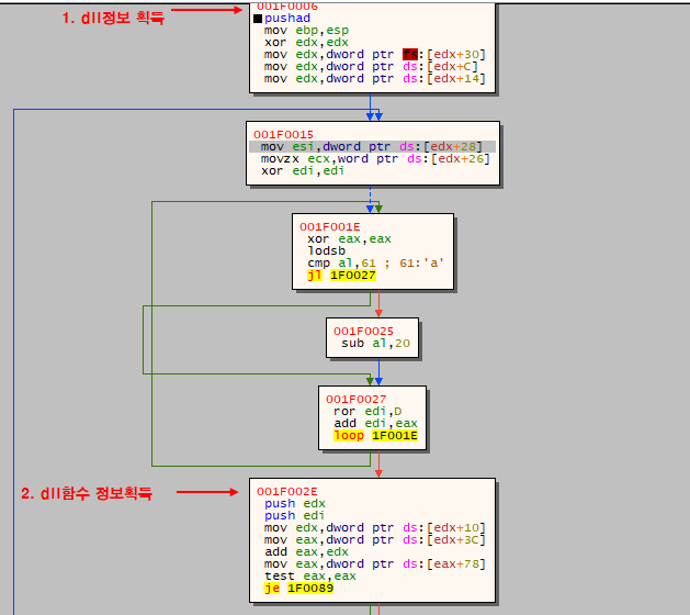 쉘코드는 IAT가 없으므로 실행 중에 필요한 DLL과 API함수 주소를 찾습니다. DLL이름과 API함수이름은 공격자가 만든 특정 알고리즘을 실행한 결과를 사용합니다.