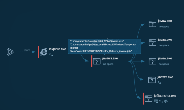애니런 샌드박스를 보면 javaws.exe(JRE)가 jnlp파일을 읽고 jp2launcher.exe를 실행했습니다. j2plauncher.exe는 jnlp파일을 해석하고 공격자 서버에 있는 자바포맷 악성코드를 실행합니다.