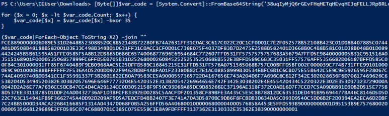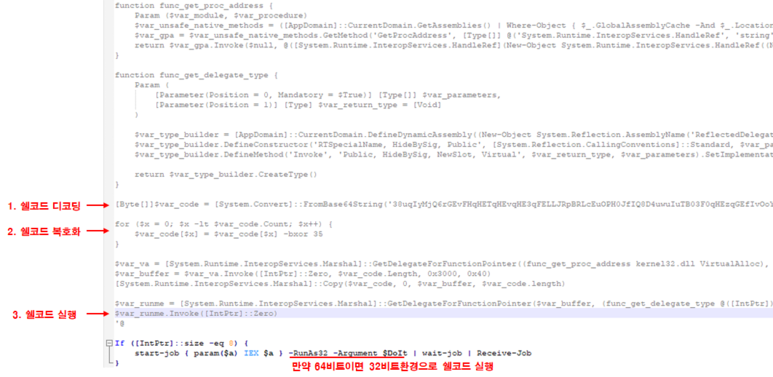 [Byte[]]$var_code = [System.Convert]::FromBase64String('base64인코딩 된 쉘코드') for ($x = 0; $x -lt $var_code.Count; $x++) { $var_code[$x] = $var_code[$x] -bxor 35 } ($var_code|ForEach-Object ToString X2) -join ""