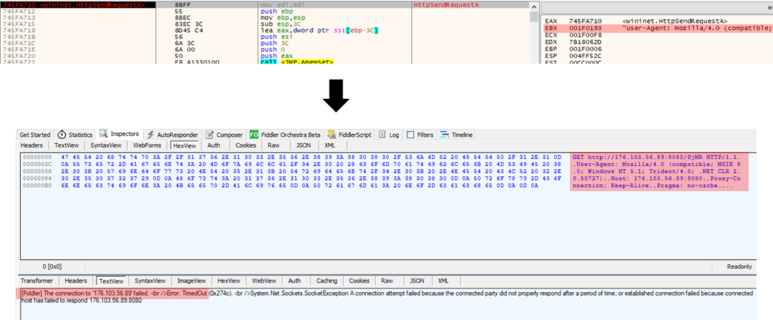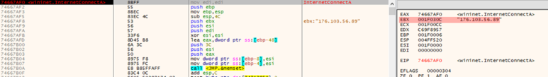 InternectConnectA함수에 브레이크포인트를 설정하면 공격자 서버 주소를 볼 수 있습니다.
