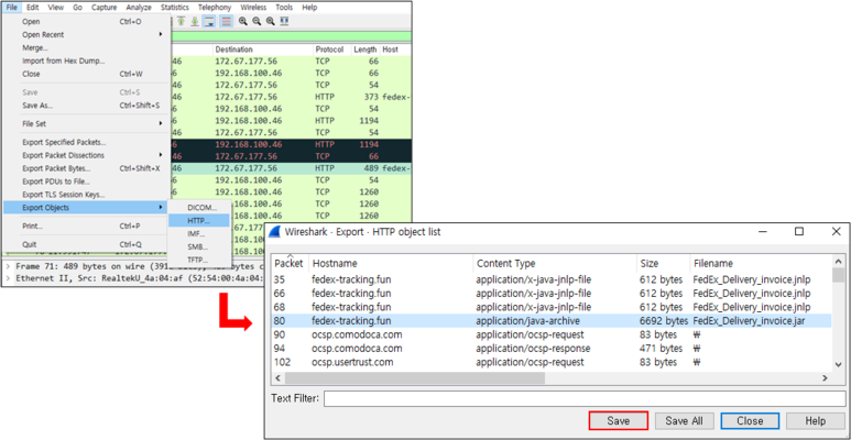 jar파일은 와이어샤크 Export Object기능을 사용해서 쉽게 추출됩니다.