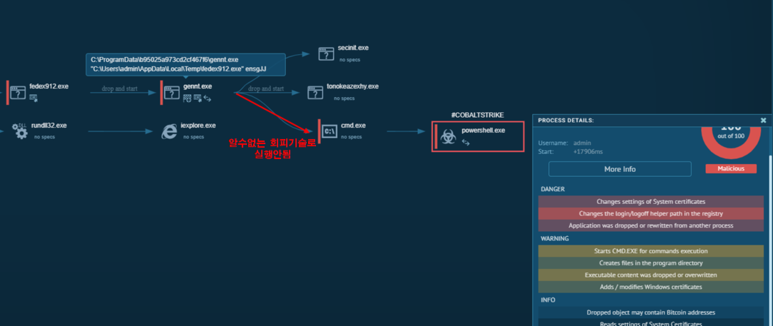 샌드박스에서는 코발트 스트라이크가 실행되지만 동적 분석에서는 알수없는 회피기술로 실행되지 않습니다. 직접 디버깅을 하시면 존재하지 않은 메모리접근 예외가 발생합니다.