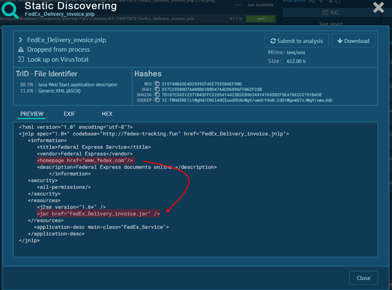 jnlp파일은 www[.]fedex[.].com의 FedEx_Deliver_invoice[.]jar파일을 실행하도록 설정되어 있습니다.