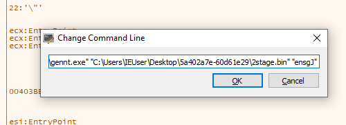 인젝션한 코드를 추출하기 위해 x32dbg로 gennt.exe를 엽니다. 그리고 샌드박스에서 발견한 인자(그림 8)를 설정하고 x32dbg를 다시 실행합니다.