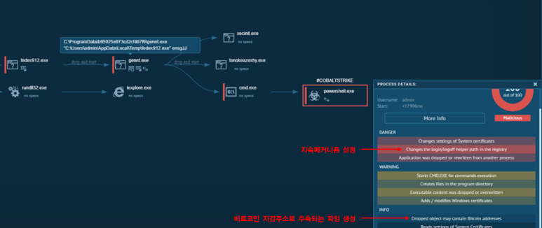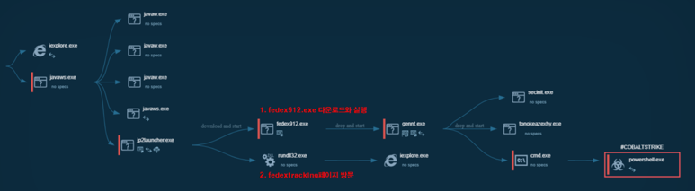 코발트 스트라이크를 실행하기 위해 총 3번의 과정을 거칩니다. 공격자 서버의 악성코드 jar파일을 실행하기 위해 jnlp파일을 이용했습니다. jar파일은 악성코드 exe파일을 실행하고 마지막으로 코발트 스트라이크를 실행하기 위해 파워쉘을 실행합니다.