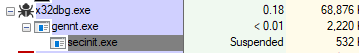 CreateProcessW에 브레이크포인트를 설정하고 실행합니다. 브레이크포인트에 멈추면 Alt + F9(Run to user code)를 눌러 CreateProcessW를 호출한 곳으로 이동합니다. secinit.exe프로세스 상태를 확인하면 코드 인젝션을 수행하기 위해 일시정지 상태로 되어 있습니다.