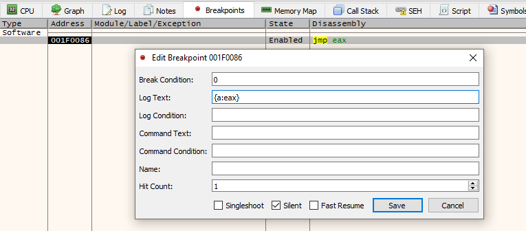 [그림 25]의 jmp eax에 브레이크포인트 조건을 설정하면 쉘코드가 사용하는 API함수 목록을 쉽게 얻을 수 있습니다.
