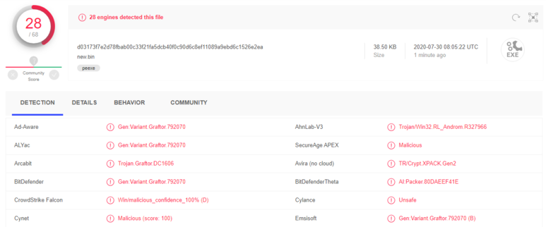 바이러스 토탈에 등록된 백신은 0x00A70000(secinit.exe에 인젝션한 코드)에 있는 데이터를 Graftor악성코드로 의심합니다.
