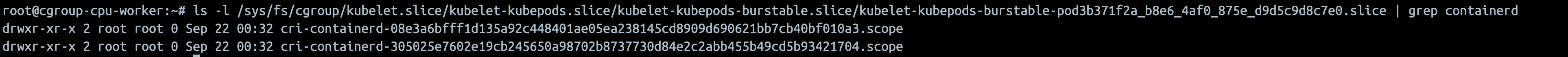 pod는 1개 이상 컨테이너를 실행할 수 있으므로, pod cgroup하위에 컨테이너 갯수만큼 cgroup이 있습니다.