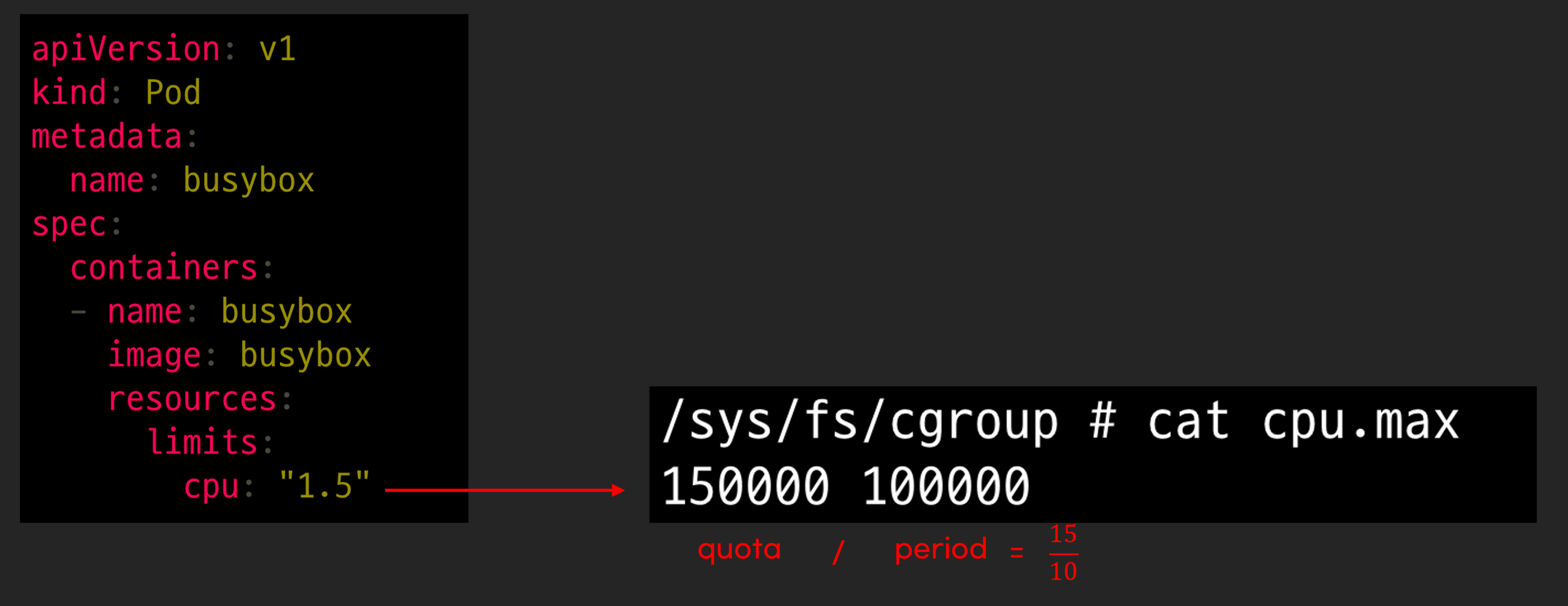 limit.cpu는 request와 다르게 계산식이 있습니다. quota / period가 계산식입니다. 예를 들어 아래 예제에서는 limit.cpu가 1.5가 어떻게 quota, period값으로 전환되는지 보여줍니다. quota가 150000ms, period 100000ms로 변환되고 계산식에 의해 1.5가 됩니다.