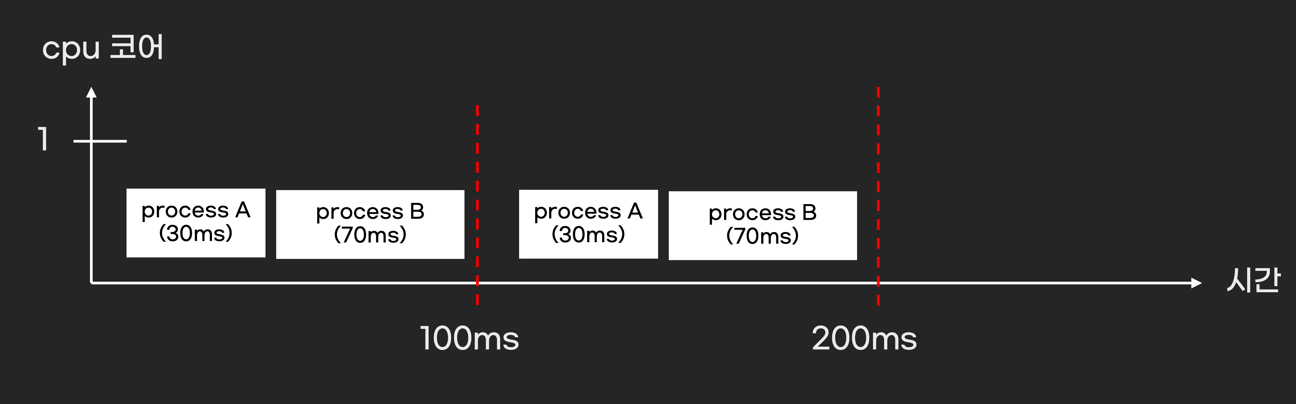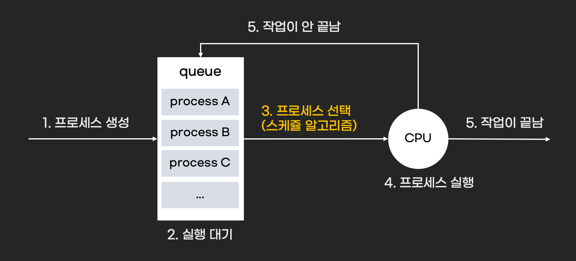 프로세스가 실행된다는 의미는 CPU가 시간을 할애하여 프로세스의 연산을 수행하는 것입니다. 운영체제는 CPU가 여러 프로세스를 효율적으로 연산할 수 있도록 프로세스를 스케쥴링 합니다. 스케쥴링은 알고리즘에 따라 동작이 다릅니다.