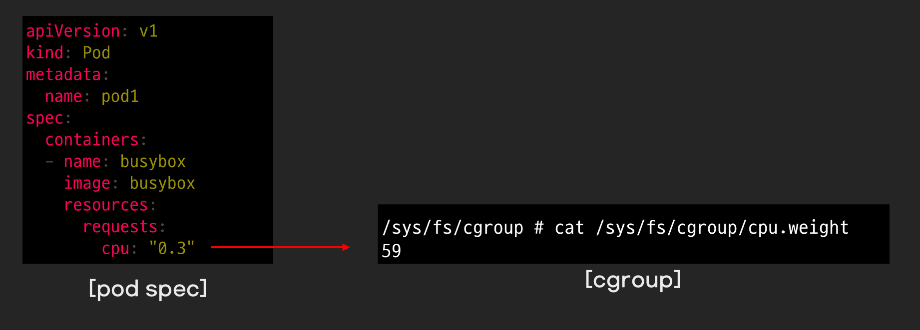 정답은 cpu 시간을 상대적으로 0.3만큼 사용하겠다는 의미입니다. 0.3코어가 아니라 상대적으로 0.3시간만큼 cpu를 쓰겠다는 의미입니다. 쿠버네티스는 request.cpu를 cgroup이 이해하는 값으로 변환하고 cgroup은 변환된 값을 읽어 프로세스에게 cpu 시간을 상대적으로 할당합니다. cgroup v1에서는 cpu share로 변환되고 cgroup v2에서는 cpu weight로 변환됩니다.