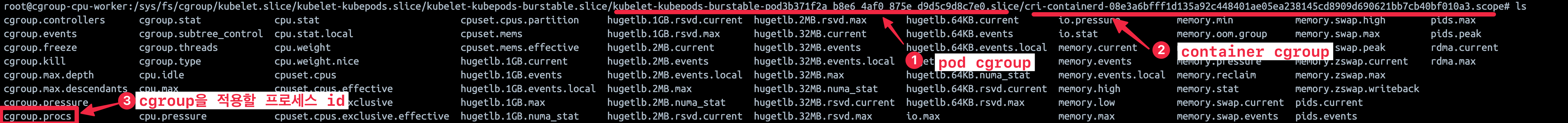 컨테이너가 마운트 한 cgroup파일들은 컨테이너를 실행하는 호스트에서도 찾을 수 있습니다. 이 원리를 사용하여 호스트에서 쿠버네티스 pod가 사용하는 cgroup을 찾을 수 있습니다.