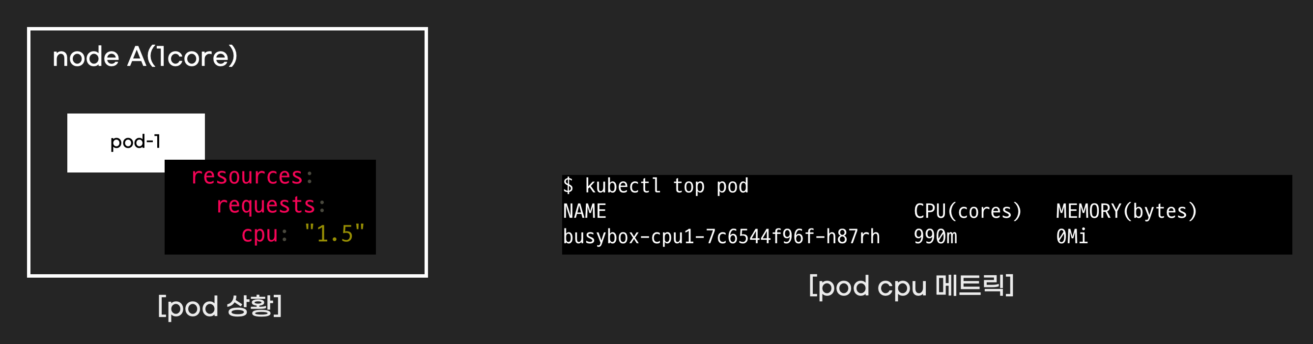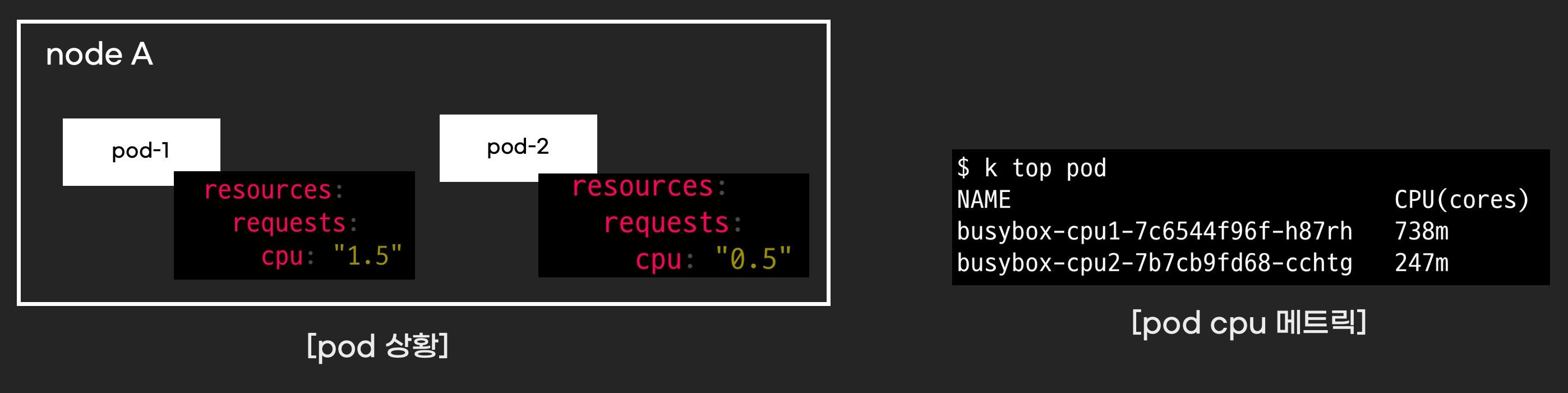 request.cpu 0.5를 갖는 pod를 생성하면 pod cpu는 어떻게 실행될까요? pod는 3:1비율로 cpu시간을 사용합니다. 1.5:0.5는 3:1이므로 pod가 3:1비율만큼 pod가 cpu시간을 사용합니다.