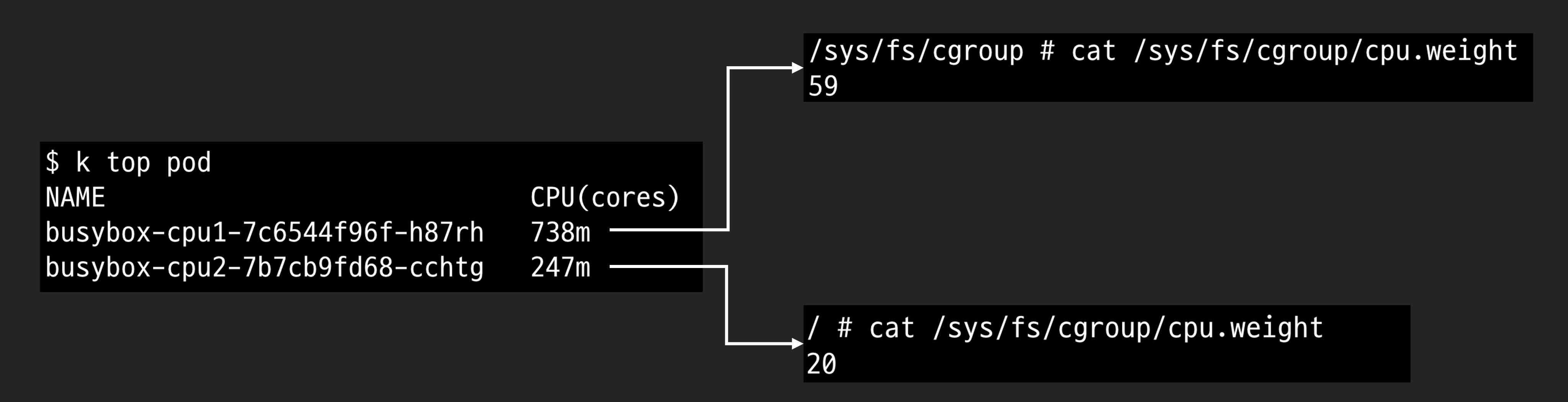 request.cpu는 cgroup값으로 변환됩니다. cgroup v2에서는 cpu.weight입니다. cpu.weight도 kubectl top결과와 마찬가지로 약 3:1비율로 설정됩니다.