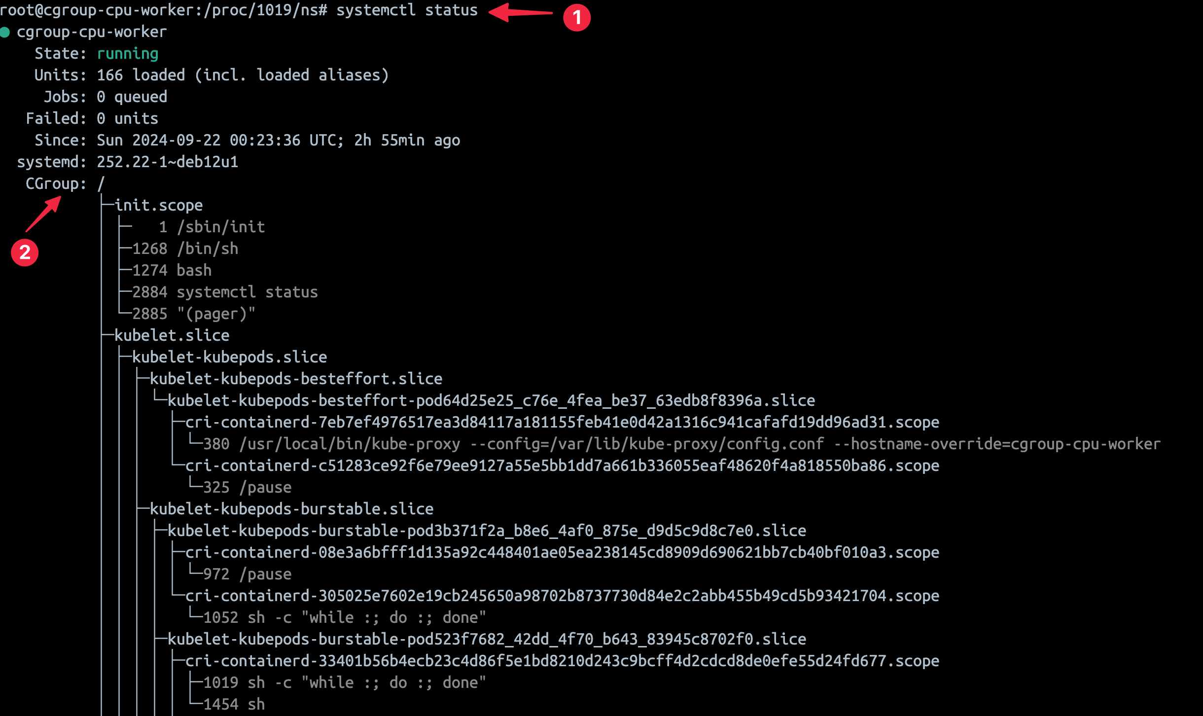 systemd로 실행되는 프로세스는 디폴트로 cgroup을 사용합니다. docker, kubelet 프로세스는 보통 systemd로 실행되기 때문에 cgroup을 사용합니다. 아래 예제는 init프로세스를 systemd로 실행했을 때 cgroup이 적용된 결과입니다.