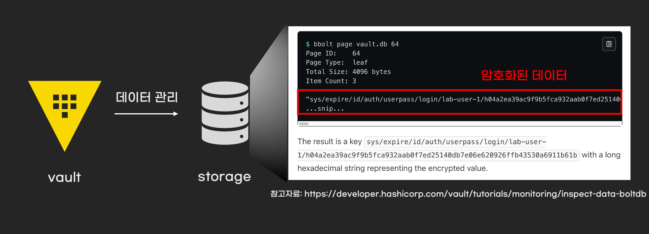 vault는 스토리지에 데이터를 저장할 때 암호화키를 사용하여 데이터를 암호화합니다. 그리고 데이터를 조회할 때는 암호화키를 사용하여 복호화합니다.