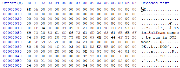 DOS stub영역에 일반 PE포맷과 다르게 Salfram문자열이 있습니다.