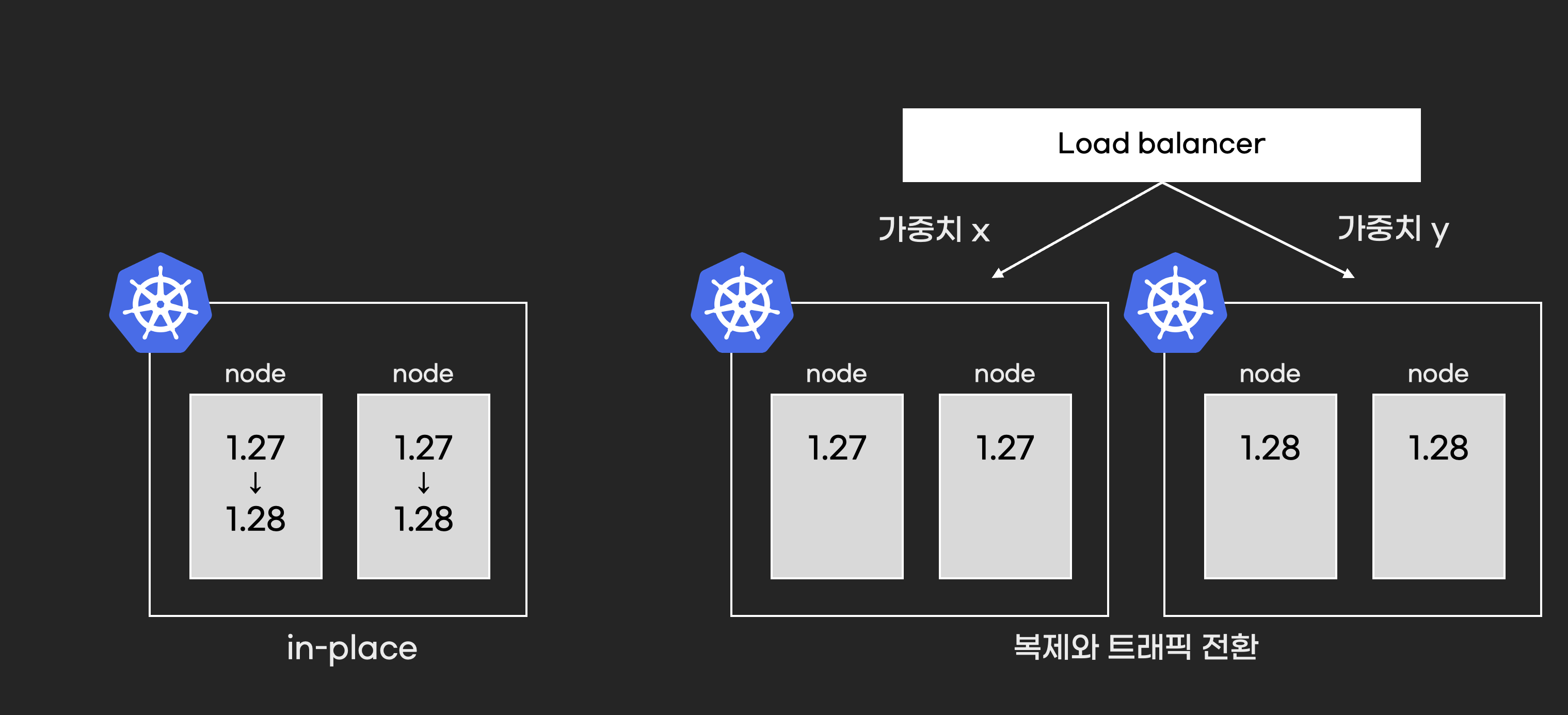 in-place는 서버 한개한개 차례대로 쿠버네티스 버전을 업그레이드 하는 방법입니다. control plane을 먼저 업그레이드 하고 worker node버전을 업그레이드 합니다. 클러스터 복제는 버전이 업그레이드 된 쿠버네티스 클러스터와 쿠버네티스 리소스를 복제한 후, 트래픽을 전환하는 방식입니다. 트래픽을 신규 클러스터에 한번에 전환하면 blue/green, 조금씩 전환하면 canary라고 부릅니다.