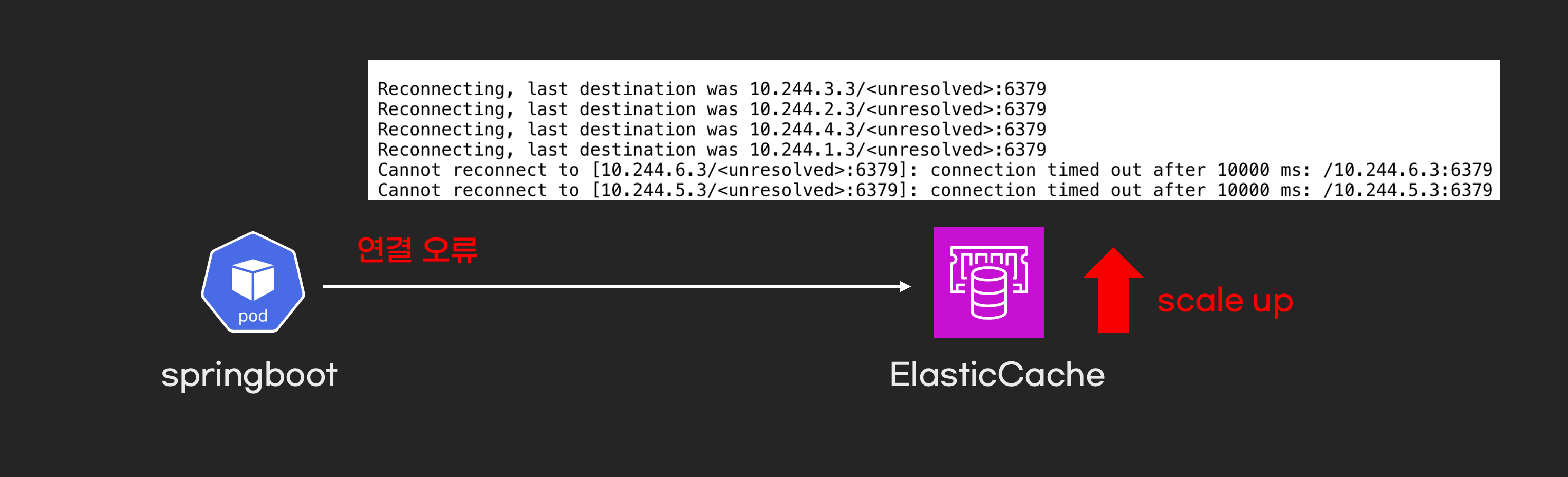 A팀은 ElasticCache redis 클러스터 성능을 높이기 위해 scale up을 결정했습니다. 그러나 ElasticCache를 scale up한 지 약 10분 뒤, Spring Boot pod에서 에러 로그가 발생했습니다. 에러 로그에는 pod가 ElasticCache 인스턴스에 접속하지 못한다는 내용이 포함되어 있었습니다.