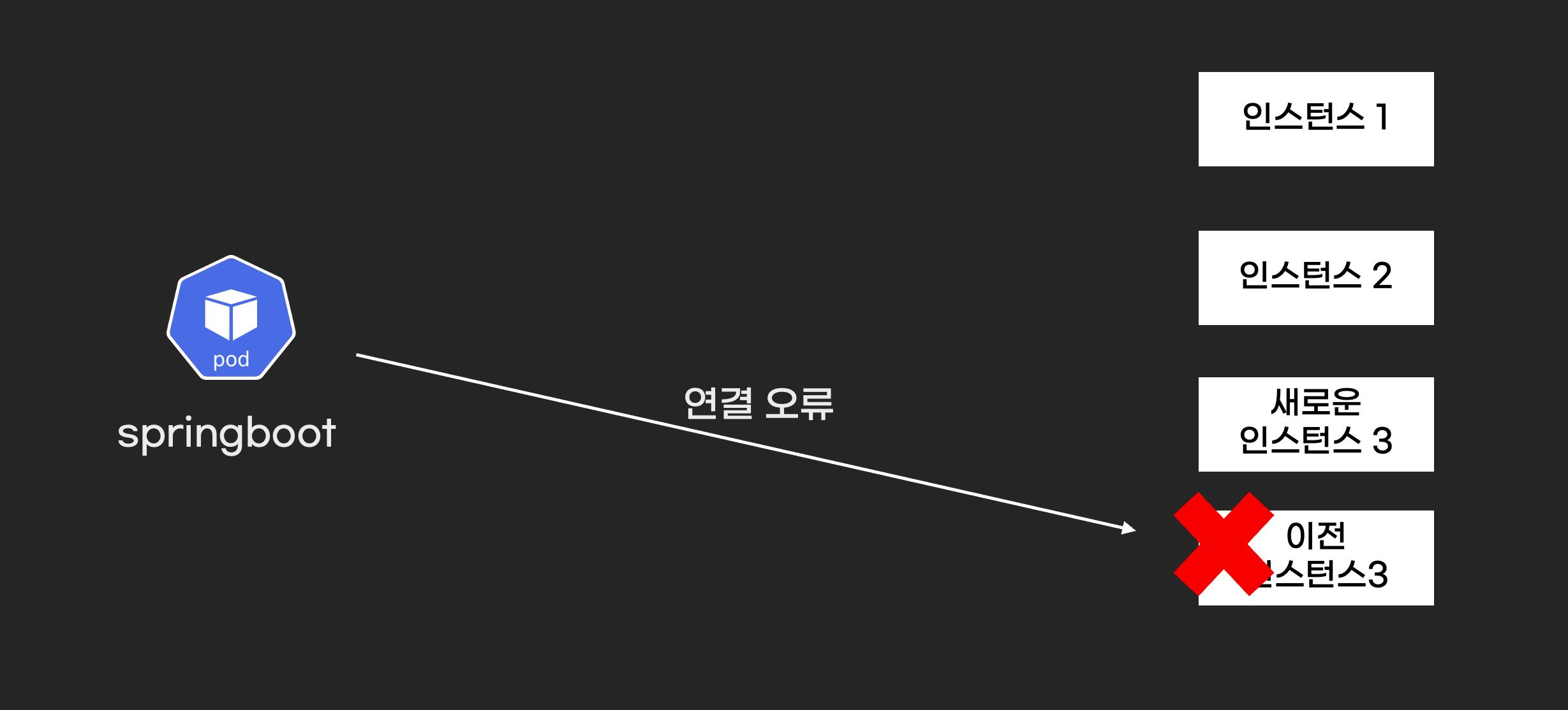 A팀은 ElasticCache redis 클러스터 성능을 높이기 위해 scale up을 결정했습니다. 그러나 ElasticCache를 scale up한 지 약 10분 뒤, Spring Boot pod에서 에러 로그가 발생했습니다. 에러 로그에는 pod가 ElasticCache 인스턴스에 접속하지 못한다는 내용이 포함되어 있었습니다.
