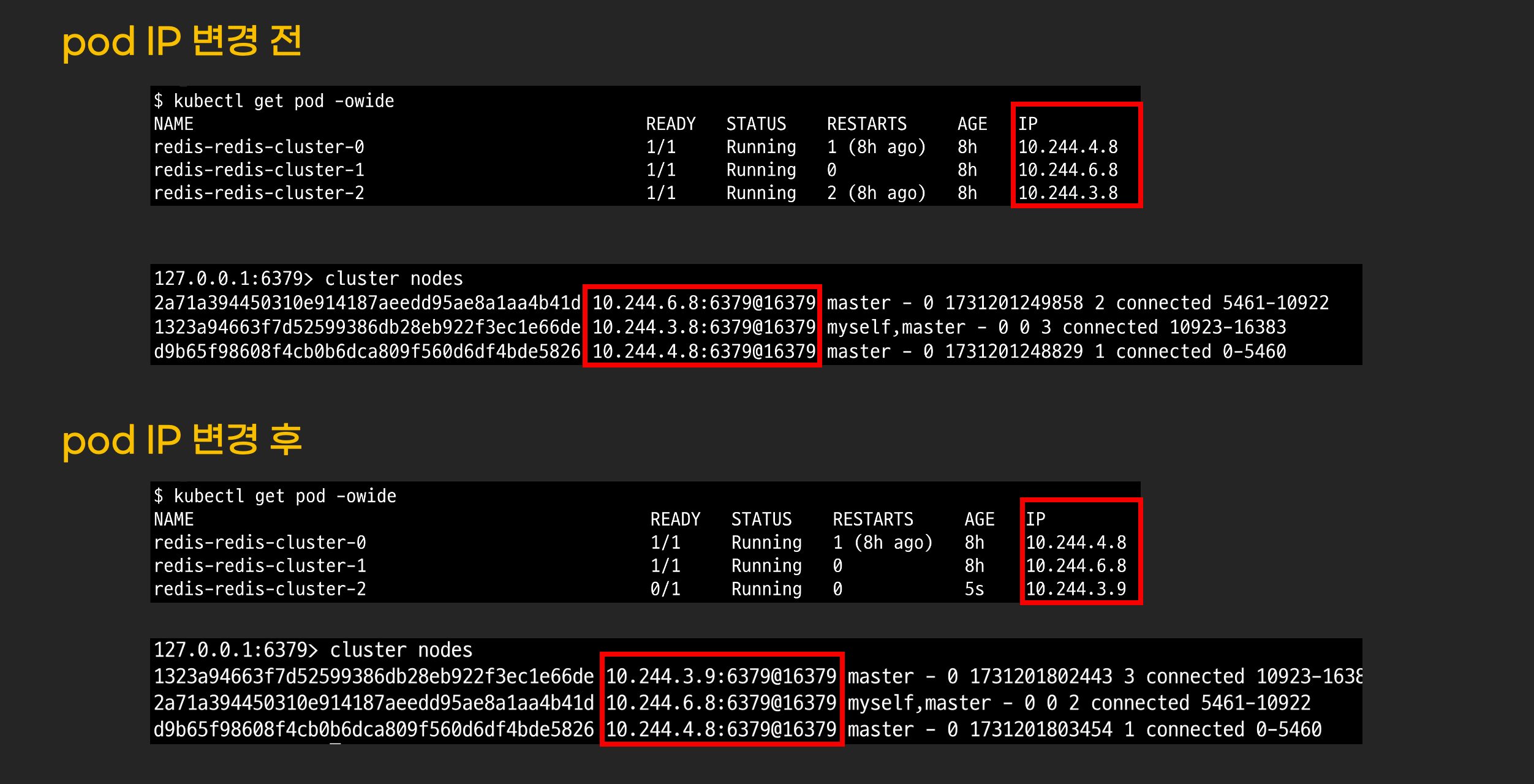 redis 클러스터는 메시 토폴로지 덕분에 변경된 인스턴스 정보를 모든 인스턴스가 압니다. 예를 들어 인스턴스 IP가 변경되면 클러스터 인스턴스(노드)정보가 업데이트 됩니다.