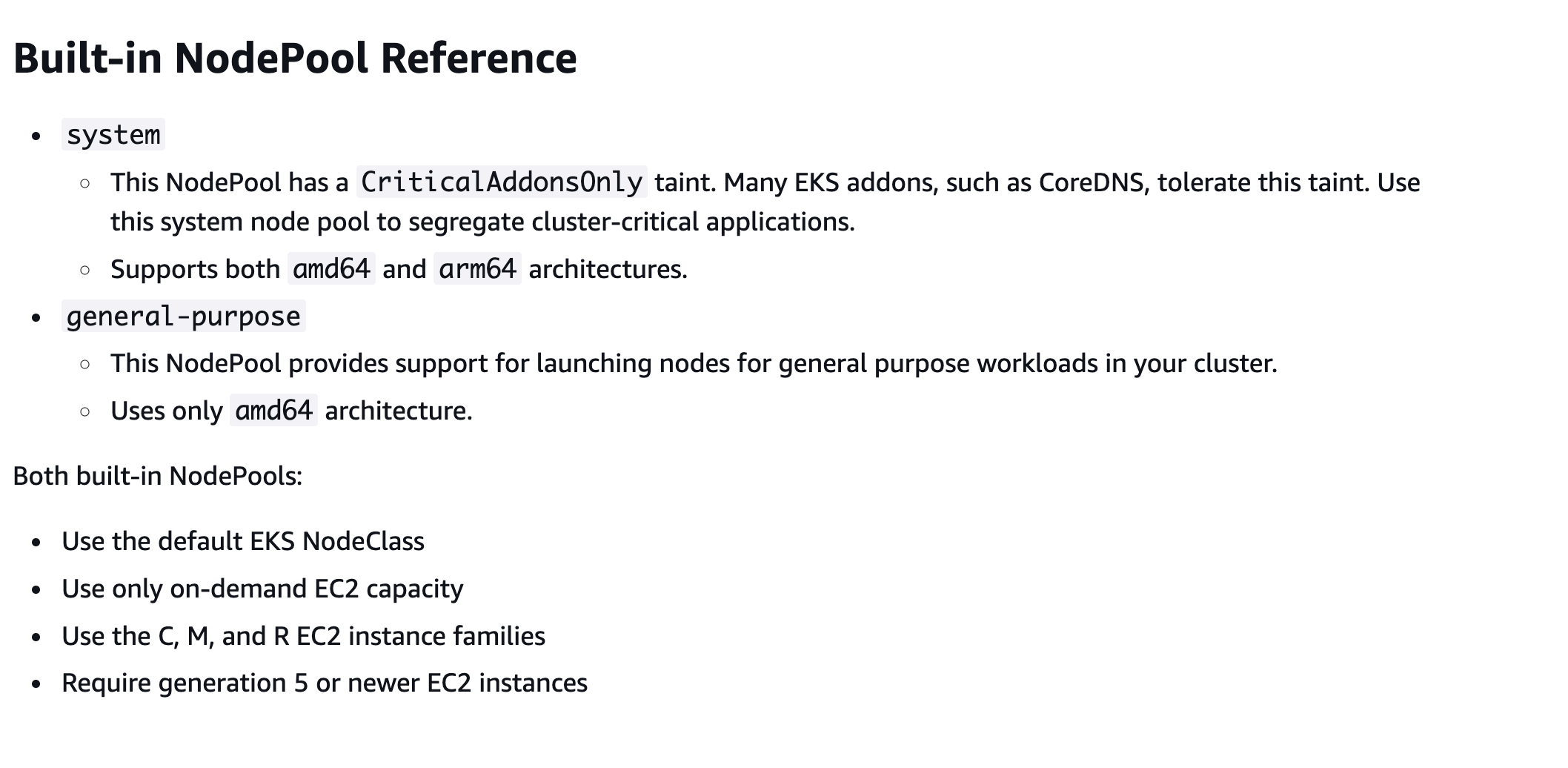 관리형 karpenter nodepool은 system, general-purpose 2개입니다. system nodepool은 taint가 설정된 노드를 생성합니다. 인프라 pod등 시스템에 중요한 pod를 스케쥴링할 때 사용하는 노드입니다. general-purpose는 이름 그대로 일반 목적으로 사용하는 nodepool입니다.