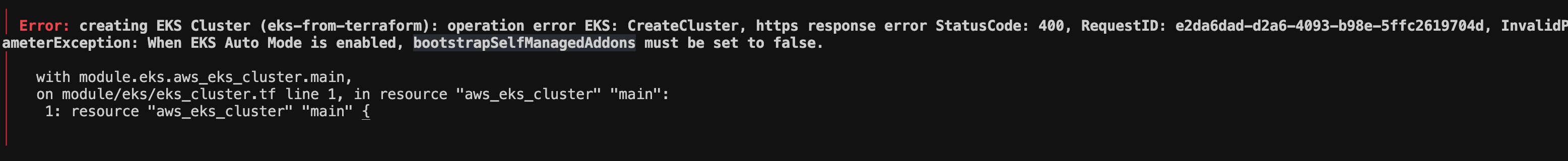 두 번째 EKS 애드온 설치를 제거 합니다. Auto Mode는 EKS 애드온을 직접 관리하므로 VPC CNI, coreDNS 등 EKS 애드온을 설치하지 않도록 설정합니다. 설정 방법은 aws_eks_cluster 테라폼 리소스에서 bootstrap_self_managed_addons를 false로 설정합니다.