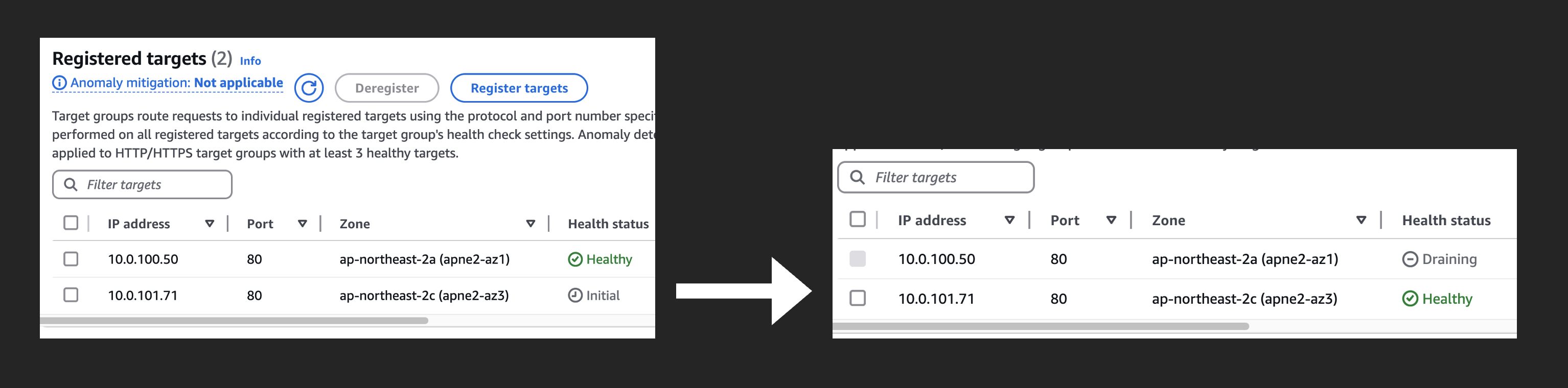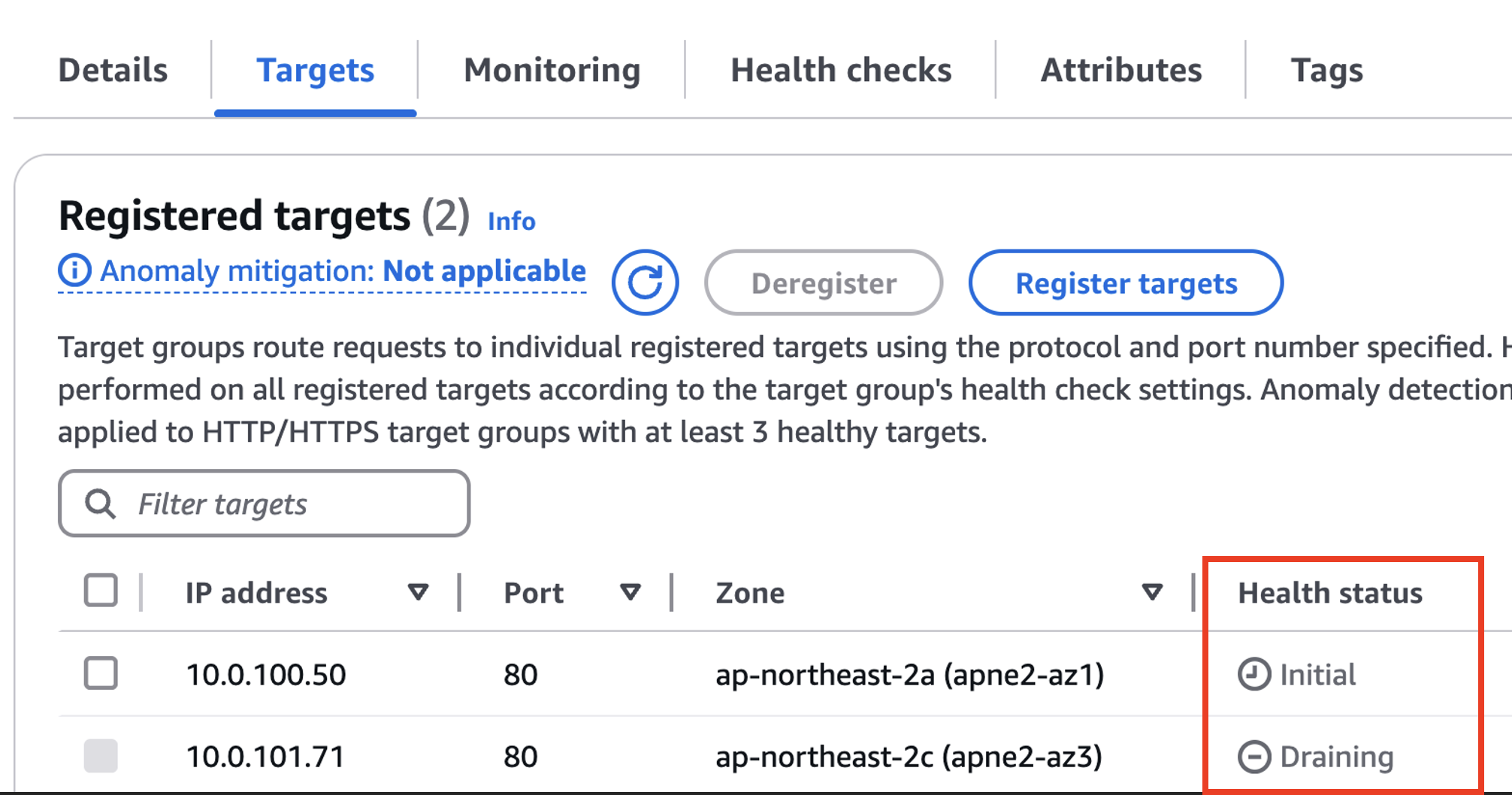 아래 그림은 AWS ALB(애플리케이션 로드밸런서)입니다. pod 개수가 1개이고 Rolling update를 한 직후를 캡처했습니다. 기존 pod는 ALB에 제거된 상태(Draining)이고 새로운 pod는 ALB에 등록되고 있는 상태(Initial)입니다.