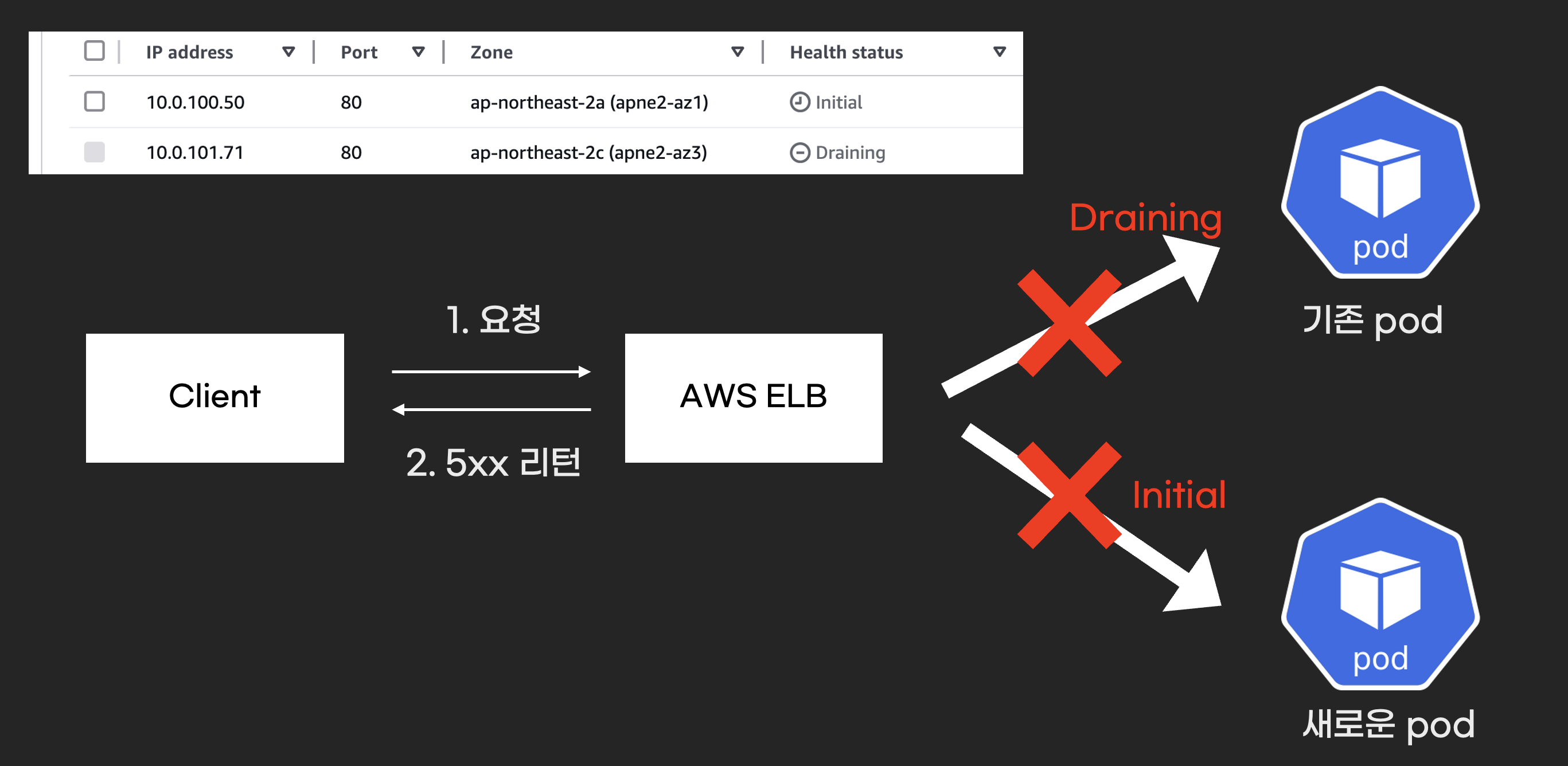 제거된 상태화 등록상태는 모두 트래픽을 받지 못합니다. 따라서 Rolling update를 한 직후에 ALB를 호출하면 ALB는 연결된 pod가 없기 때문에 5xx HTTP 상태코드를 리턴합니다.