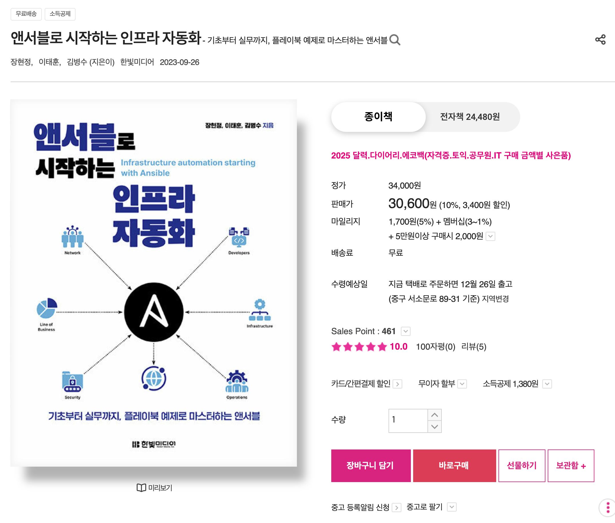 2024년을 기준으로, 앤서블을 처음 접하거나 기초를 탄탄하게 다지고자 하는 분들에게 『앤서블로 시작하는 인프라 자동화』를 추천드립니다. 제가 이 책을 읽고 좋았던 점은 꼭 필요한 앤서블 사용방법만 설명했습니다. 그리고 적당한 난이도의 예제가 좋았습니다.