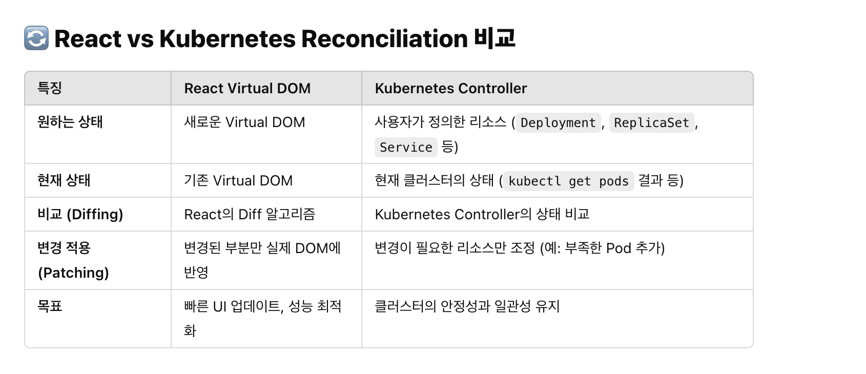 2025년 설날에 ReactJS를 공부를 하고 있었는데, ReactJS 동작원리가 쿠버네티스 controller manager와 매우 비슷하다는 것을 느꼈습니다.